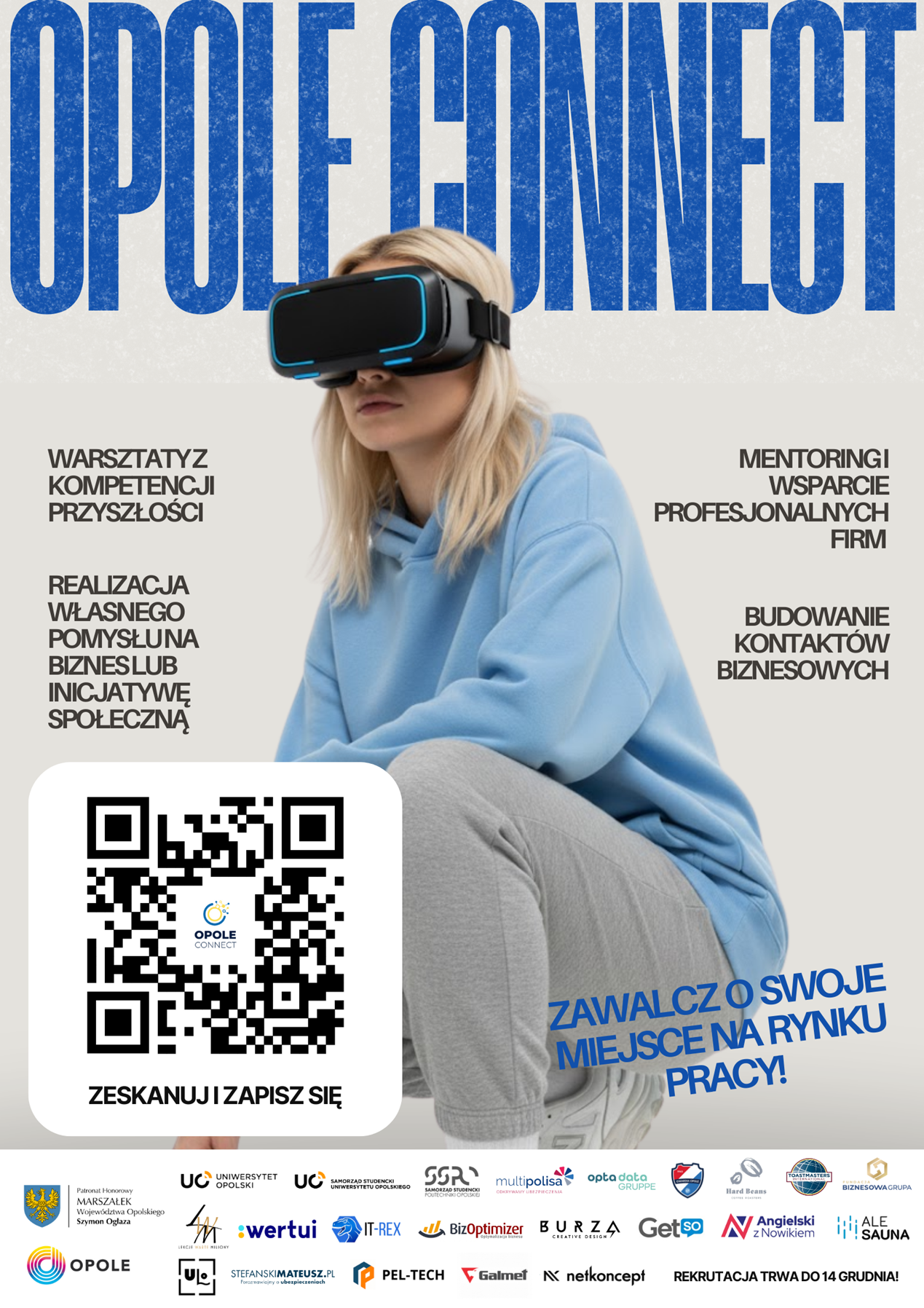 Jeśli studiujesz na Uniwersytecie Opolskim i chcesz dołączyć do II edycji programu Opole Connect, wystarczy, że wypełnisz formularz rekrutacyjny dostępny na stronie projektu. Kliknij poniżej w napis „więcej informacji” lub zeskanuj kod QR na plakacie.