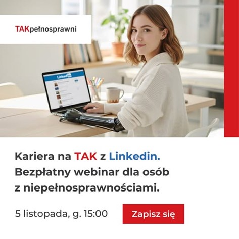Fundacja TAKpełnosprawni zaprasza osoby z niepełnosprawnościami na bezpłatny webinar o LinkedIn – praktyczne spotkanie pokazujące, jak wykorzystać tę platformę w rozwoju kariery.